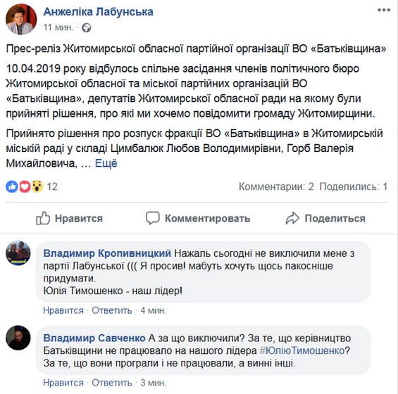 10 апреля на совместном заседании членов политического бюро Житомирской областной и городской партийных организаций ВО «Батькивщина», депутатов Житомирского областного совета были приняты решения о роспуске фракции в Житомирском городском совете и исключения из рядов партии четырех депутатов горсовета Любви Цимбалюк (председатель фракции), Ивана Мартынчука (секретарь фракции), Людмилу Кропивницкого и Валерия Горба. Далее расскажет «Yes-Zhytomyr»